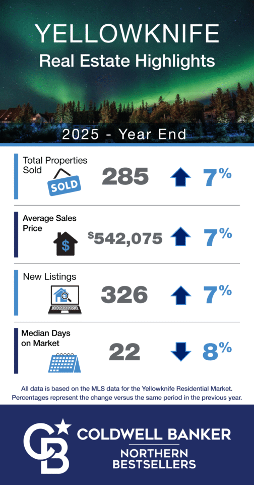 Yellowknife Real Estate in 2025 was busy! It was the most active year for sales in Yellowknife since 2022 with 285 total sales just in Yellowknife. Our average price for sold properties in Yellowknife rose 6.5% to $542,075 up from $509,055 in 2024. On average properties sold at over 99% of their listed price meaning there was overall very little room for negotiation with sellers in large part getting what they asked for. This new elevated average sale price is a 30% increase from 2020! We at Coldwell Banker accounted for 40% of the sales activity in 2025 with a total of 253 closed sales, an average of over 30% more than either of our competitors. We are so grateful for all our loyal clients who make it possible for us to continue to serve as Yellowknife’s #1 Real Estate brokerage.