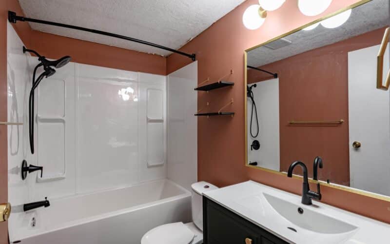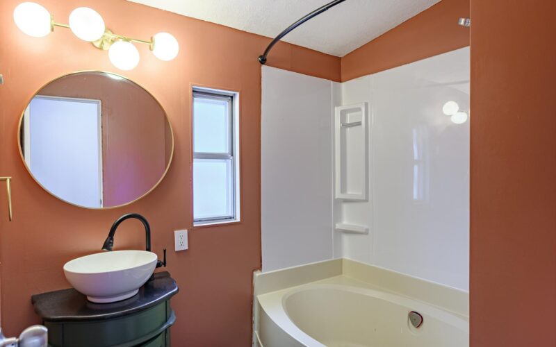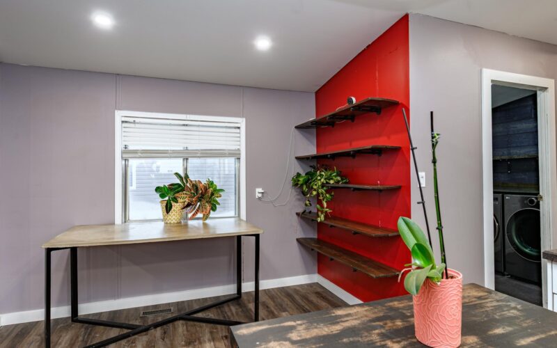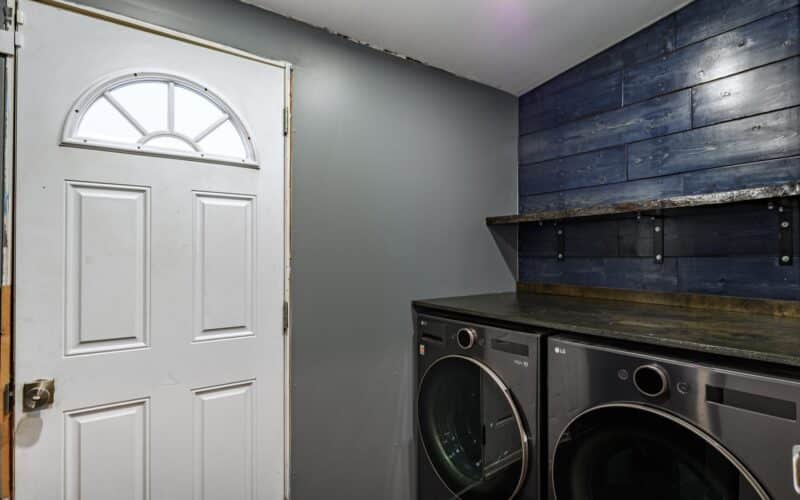 Toward the back of the home, you’ll find a contemporary kitchen with stainless steel appliances, sleek white cabinetry, a stylish backsplash, and an island. The adjoining dining area is warm and inviting, which is perfect for family dinners or entertaining guests. A second bedroom and full bathroom are also located at the rear, offering privacy and comfort for family members or guests. The updated laundry area doubles as a mudroom with direct access to the backyard.