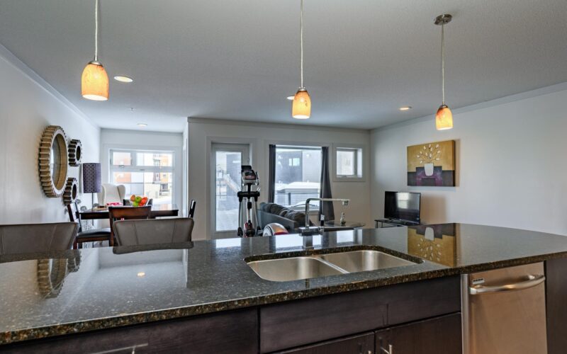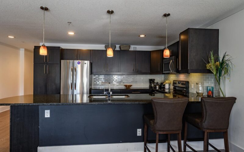 The front deck receives morning sun and offers partial big lake views. One paved & electrified parking stall. Inside onsite mail boxes. Laminate and laminate tile flooring. The well-appointed kitchen features granite counter-tops, cappuccino colored cabinets including a pantry cabinet stainless appliances, & numerous bar stool spots along the kitchen peninsula making it great for entertaining. The kitchen also features a tiled backsplash, under cabinet lighting, built-in wine rack, & a double stainless sink. Pot lighting in kitchen living and dining areas. The bathroom features a top mounted glass vessel sink & full tiled tub surround. Appliances are a mix of Maytags & Whirpool,