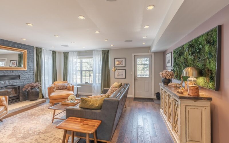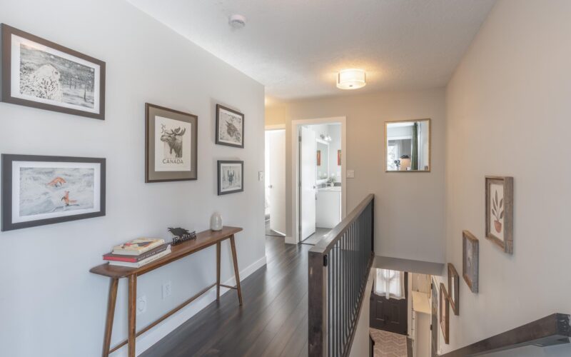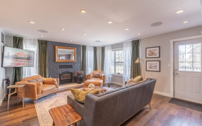 The kitchen is the true centrepiece featuring a stunning 9’ quartz island with pendant lighting, quartz countertops, shaker-style cabinetry with built-in organizers, stainless steel appliances, a propane cooktop, pantry closet, and a built-in wine fridge. The kitchen flows effortlessly into the cozy living room, complete with a WETT-certified wood-burning Heatilator fireplace, built-in speakers, and direct access to the rear deck. A convenient half bath completes the main level.