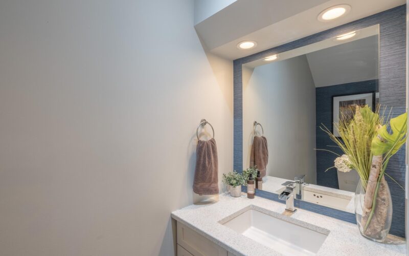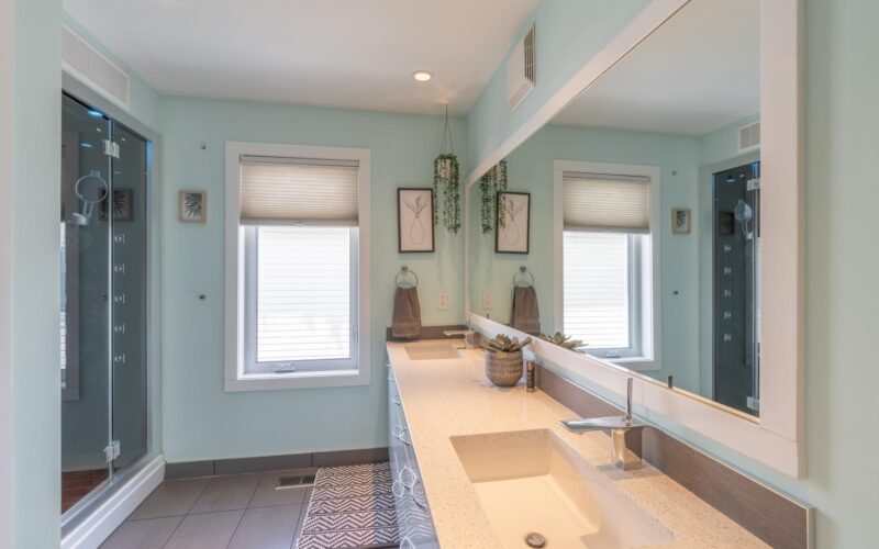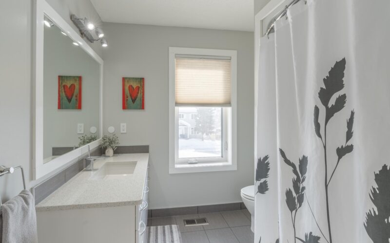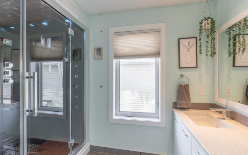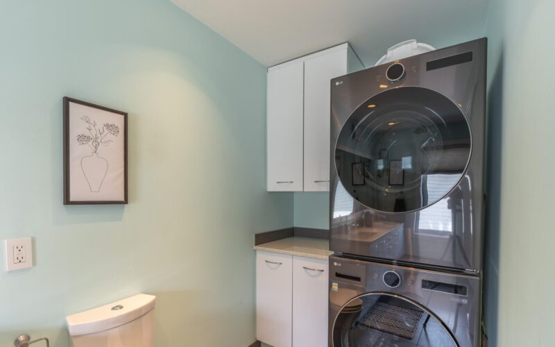 Upstairs, bamboo flooring runs throughout, with three bedrooms and two full bathrooms. Both bathrooms feature quartz countertops, while the ensuite offers double vanities, built-in cabinetry, and a luxurious multi-jet steam shower with integrated stereo. The washer and dryer are also conveniently located within the ensuite as well.