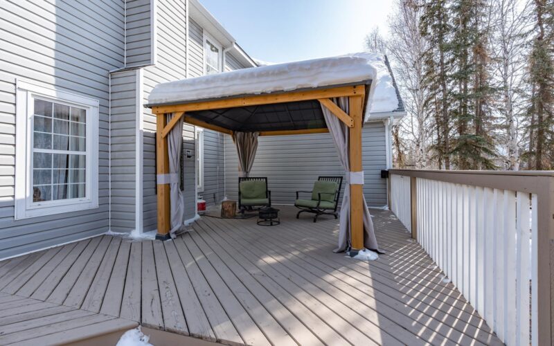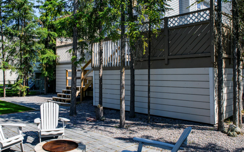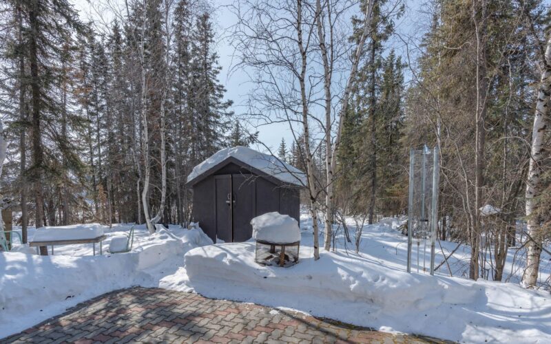 Above, the massive upper deck is made for hosting, with plenty of room for summer gatherings. Built on steel piles, it’s ready for a future hot tub and already includes the proper electrical setup, built-in speakers, and a direct propane line for seamless BBQs and outdoor entertaining. Below, you’ll find additional heated storage in the crawlspace, where the home’s utilities are also located. The side yard, private and neighbour-free, offers an interlocking brick patio with a storage shed and even an outdoor shower, giving off peaceful cabin-style vibes.