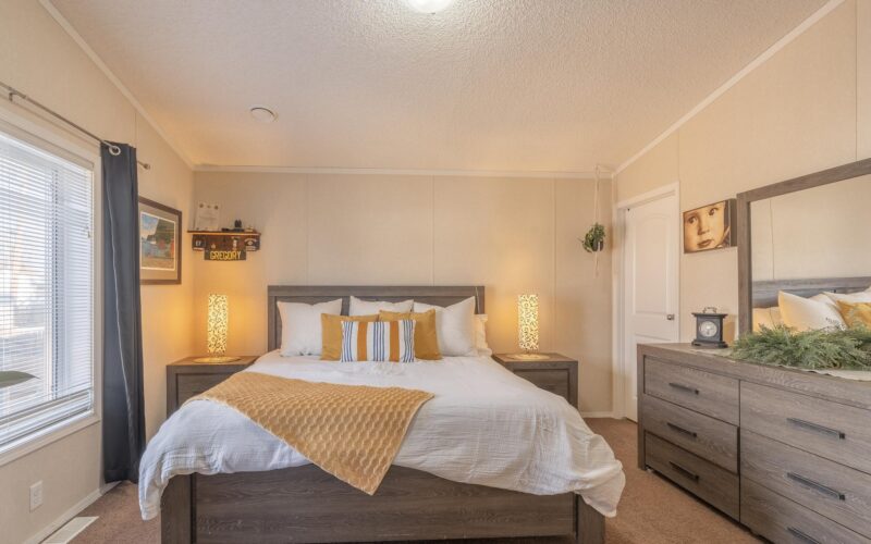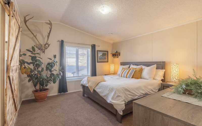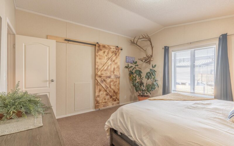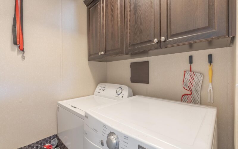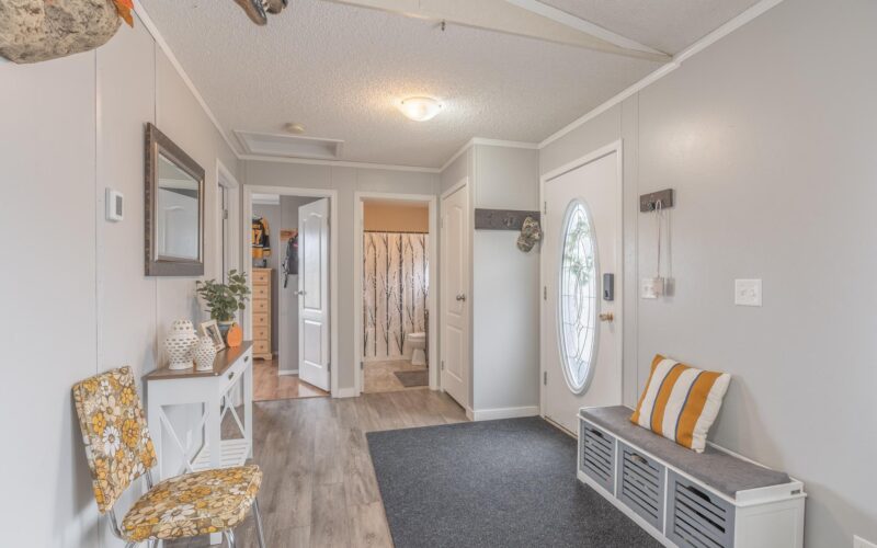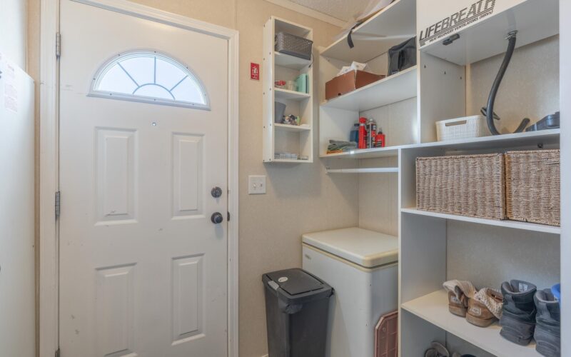 The primary bedroom offers a walk-in closet with organizers and a barn-door ensuite featuring a deep soaking tub. Two additional freshly painted bedrooms include built-in shelving, hooks, and organizers, and they share a full main bathroom conveniently located near the front of the home. At the back of the home, you will also find a dedicated laundry room (with upper cabinetry and a new propane dryer) plus a rear mudroom area with access to the deck and backyard.