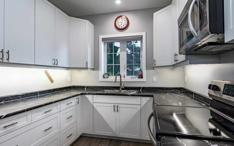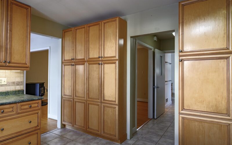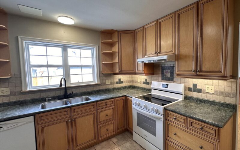 - Custom maple cabinetry in kitchen and baths with ample countertop space & cupboards