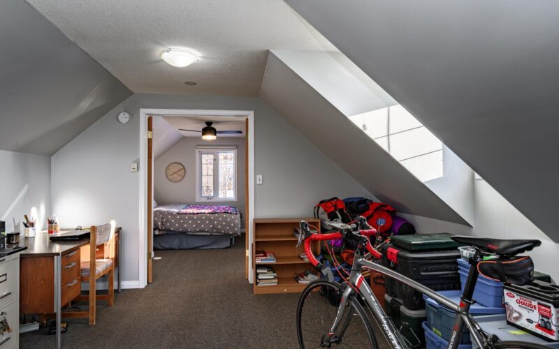 It features a well-appointed kitchen and bath, plus a primary bedroom on the main floor—ideal for professionals or aging-in-place for multigenerational families. The second storey has charming features and is currently used as a fitness and office area, with two beautiful dormers that allow plenty of natural light.